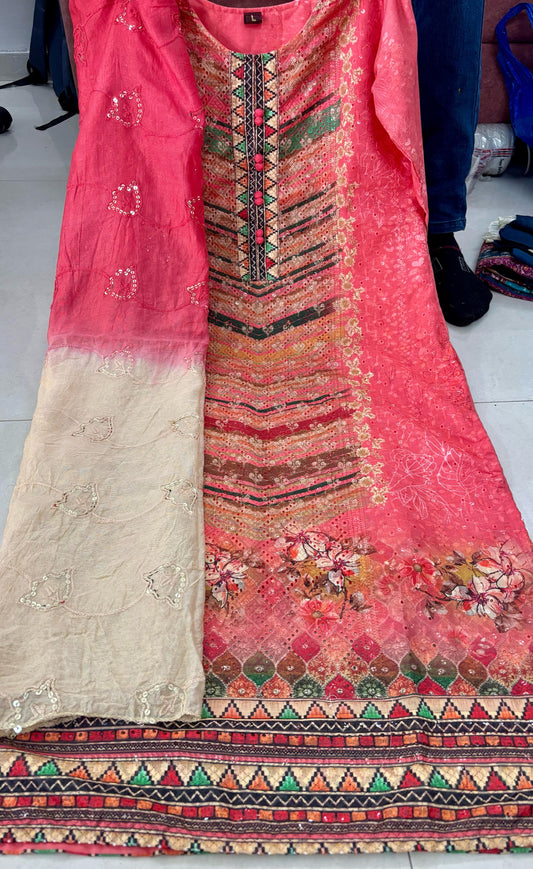 Pink and Pista Green Ethnic Kurti Heavy Rayon Foil Set - 3pc
