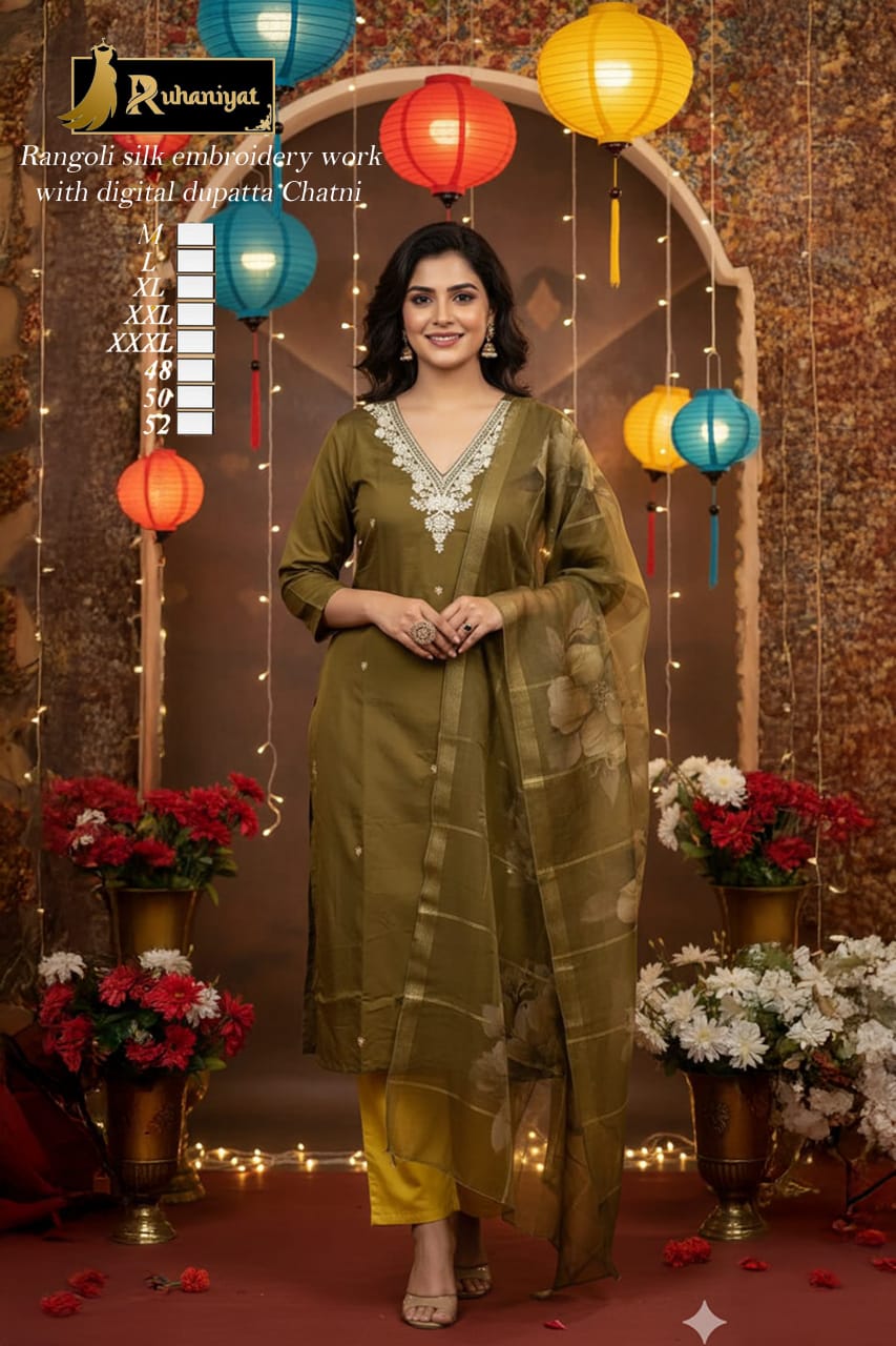 Crafted from fine Rangoli silk, this set has a smooth texture and a luxurious feel. The fabric offers an elegant drape, perfect for festive wear.