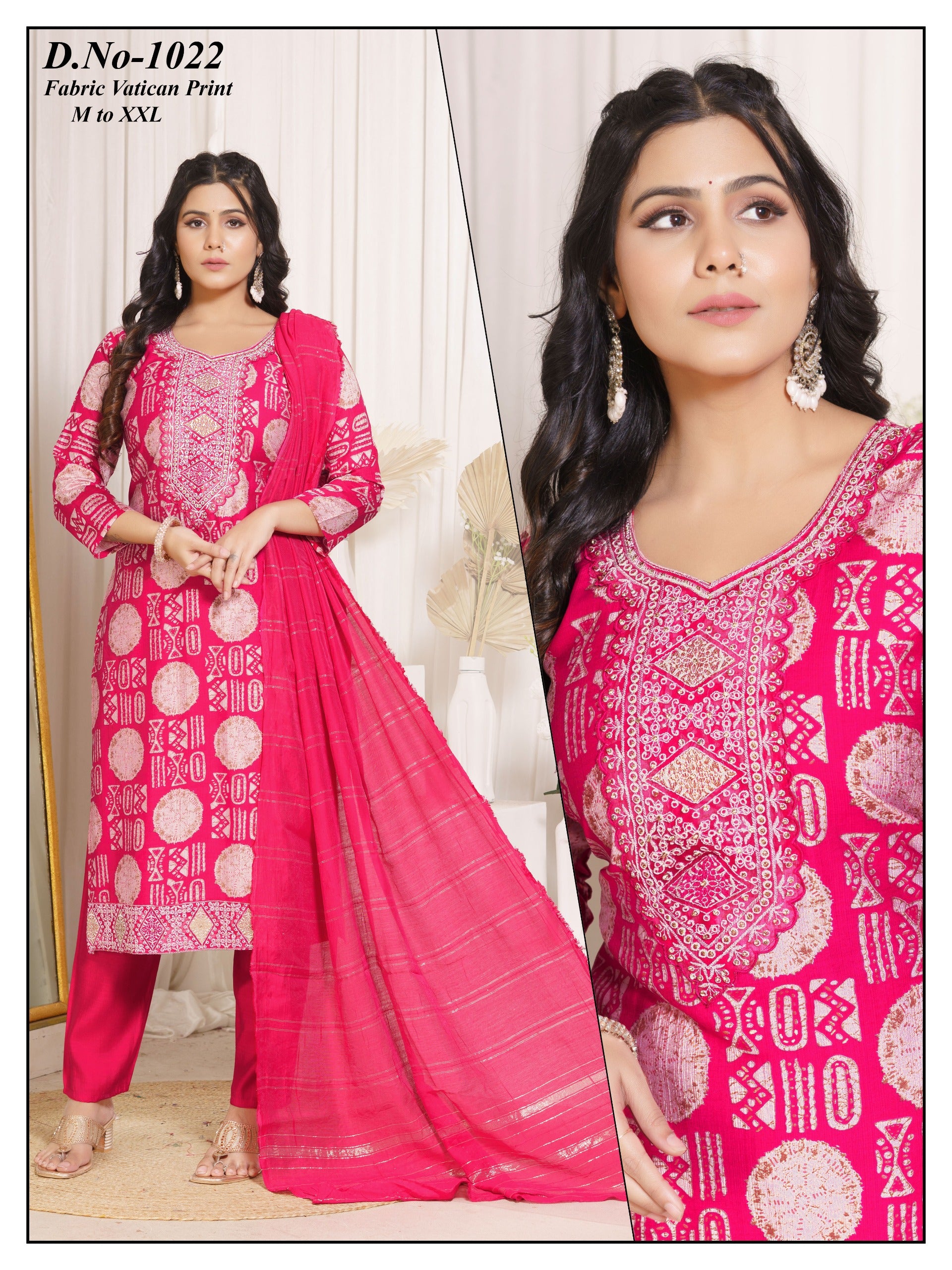 for the kurti and pants, a fabric known for its rich feel and smooth drape. The dupatta is a lightweight material with a digital print.